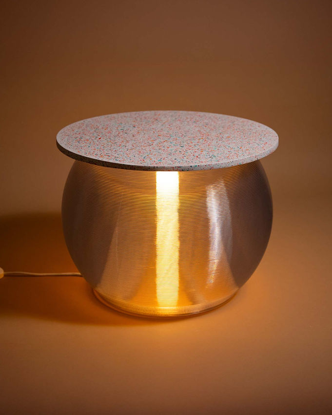 How is it made? Bubble is made on our in-house developed 3D printer. We directly melt from recycled plastic pellets to create wave. More information about our plastic sourcing can be found on the product page. The table top is made from jesmonite and hand crafted by Dottie & Olive.